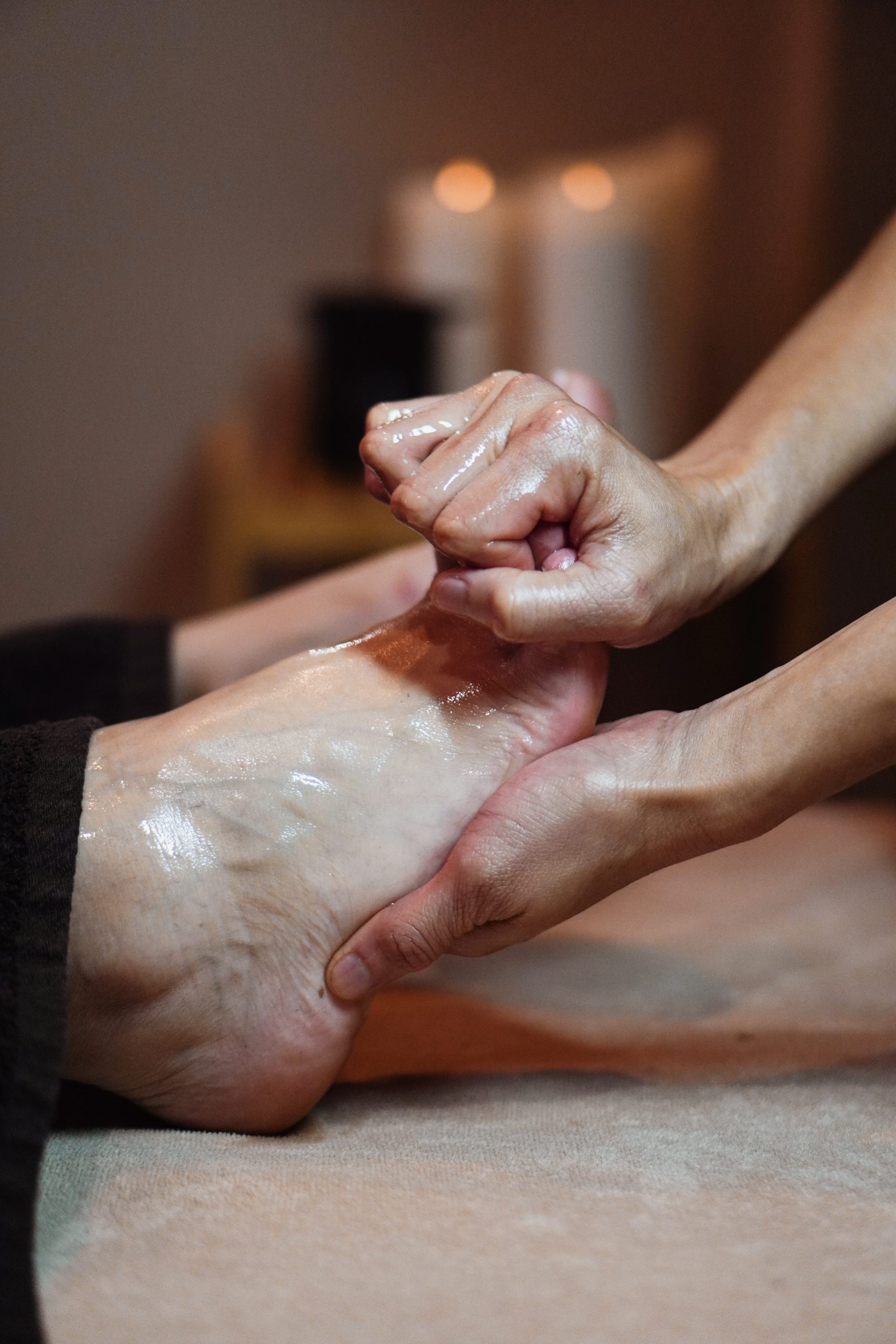 Leczniczy masaż stop i łydek. Stymuluje określone punkty z medycyny chińskiej działając na całe ciałoMasaż stóp, refleksologia